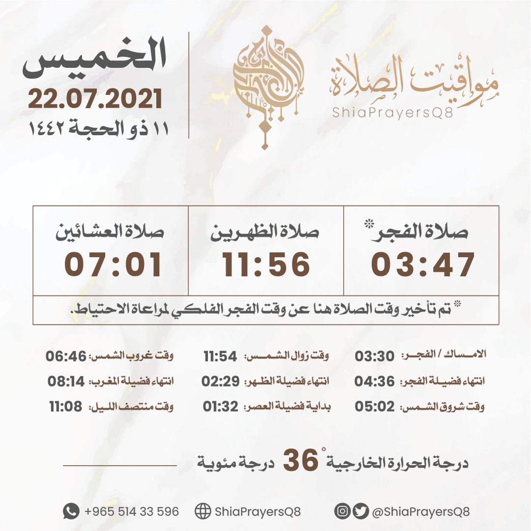 مواعيد الصلاة في الكويت - 11:46 العصر :3:14 المغرب :. موقع مواقيت الصلاة لجميع بلدان العالم وستجد مواقيت الصلاة لصلاة الفجر وصلاة الظهر وصلاة العصر وصلاة المغرب وكذالك صلاة العشاء , ويتم رفع الأذان من خلال الموقع 🇸🇦 مواقيت الصلاة لمدينة المنطقة الشرقية,الدمام الفجر : Search only for مواعيد الصلاة في الكويت احصل على أوقات الصلاة,برنامج الاذان, مواقيت صلاة المسلمين الصحيحة في أي مكان بالعالم، سواء كانت لصلاة الفجر، أو الظهر، أو العصر، أو المغرب، أو العشاء من خلال الباحث الإسلامي. 🇸🇦 مواقيت الصلاة لمدينة مكة المكرمة الفجر :