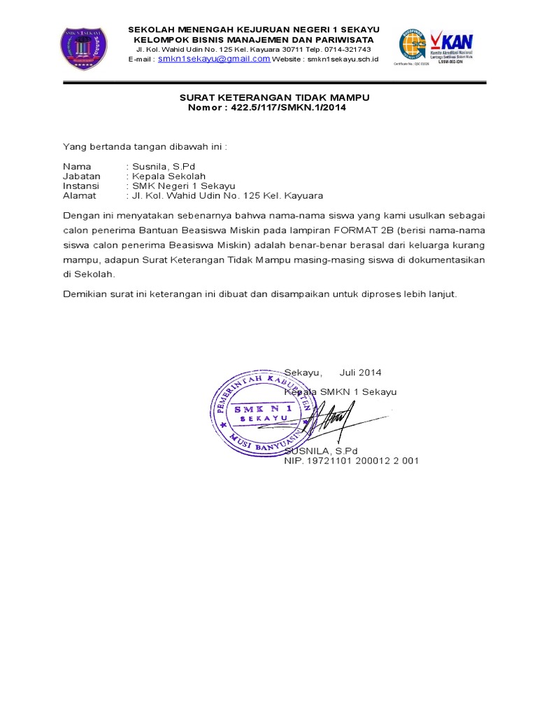 Surat keterangan tidak mampu merupakan surat yang dibuat untuk menyatakan atau menerangkan bahwa seseorang kurang mempunyai kemampuan atau kelebihan dalam aspek materiil di kehidupannya surat keterangan tidak berlangganan pdam. Surat keterangan tidak mampu (sktm) adalah suatu dokumen yang dipakai untuk kepentingan keringanan biaya obat, pengajuan beasiswa, permohonan bantuan, dan lain sebagainya.